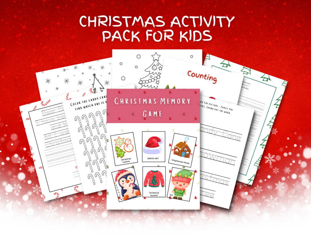 The Kids Christmas Activity Pack is a great way to keep your children occupied and learning during the holidays! This pack includes a Christmas memory game, practice writing and counting worksheets, coloring pages and letters to Santa. Perefect for teachers in the classroom, homeschooling, parents and grandparents to keep the kids activley learning while having fun!