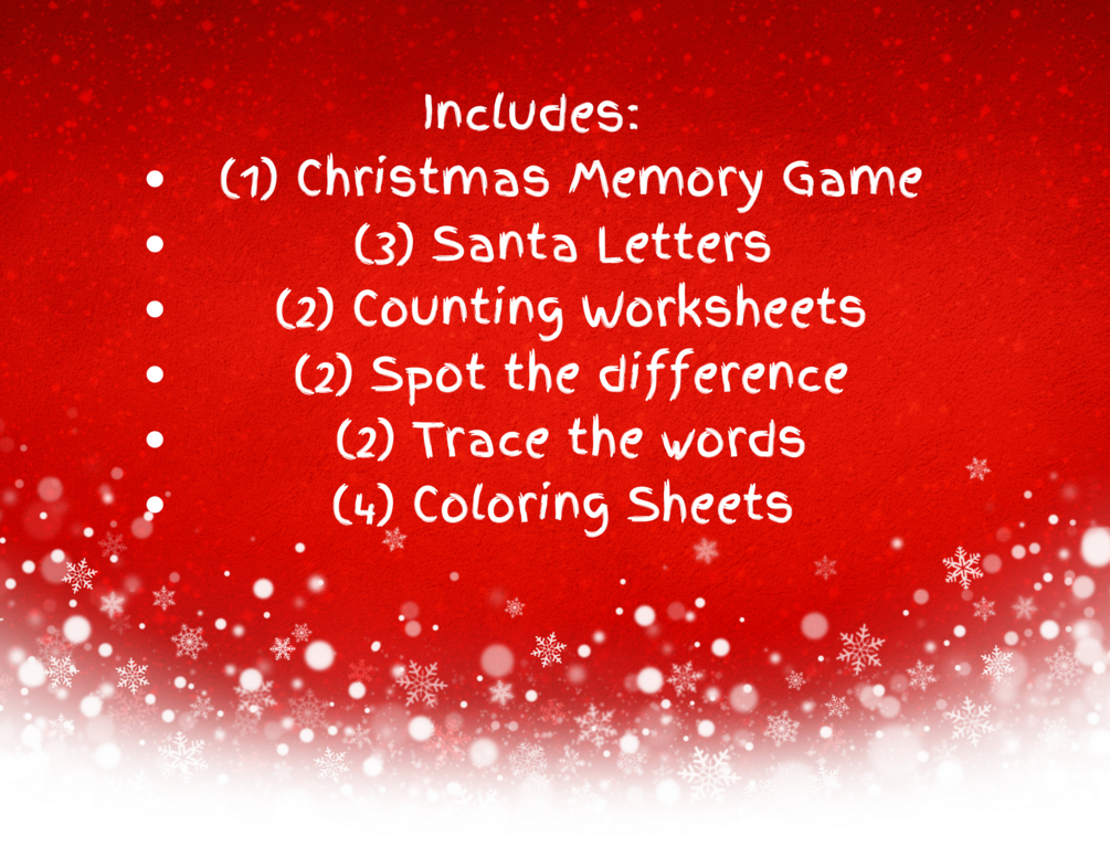Includes: (1) Full Colored Christmas Memory Game (2) Counting Worksheets (1) full color (1) count and color (2) Can you spot the difference? Coloring worksheets (2) Trace the word handwriting worksheets (4) Coloring Pages (3) Letters to Santa! Trace the letters and write on your own!